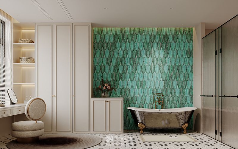 由于三层空间较为丰富,且业主注重自己私密生活,所以设计师将主卫往大气舒适方向打造,利用玻璃门进行干湿分离,同时选用有层次感的绿色瓷砖点缀浴缸墙,强调艺术与优雅。靠窗区域,设计师则设计了桌椅等,并加入梳妆镜等物件,满足女业主梳妆需求。