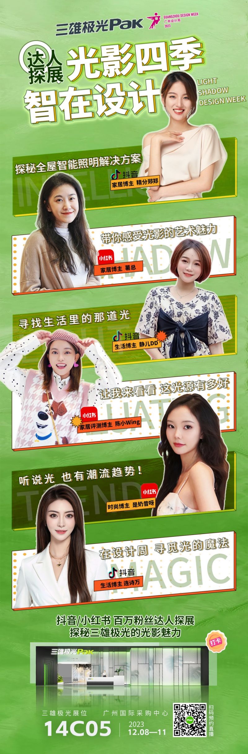 一季一光景,一区一惊喜。此次三雄极光展馆共设五个区域,分门别类地展示多样化的高品质产品。届时还有一众网红达人亲自到现场探展,抖音家居博主⌈精分郑郑⌋打卡灯光美学设计,探秘全屋智能照明解决方案;小红书家居博主⌈薯总⌋带大家领略从四季里获取的灯光灵感,感受光影的艺术魅力;抖音生活博主⌈静儿DD⌋揭秘高端照明新品,开启一场未来时空旅行;小红书家居测评博主⌈陈小Wing⌋鉴赏高品质光源,探索照明行业的高质量发展之路;小红书时尚博主⌈是奶昔呀⌋解读灯光的潮流趋势;抖音生活博主⌈连诗万⌋在照明学院与设计师进行现场交流。敬请期待吧~