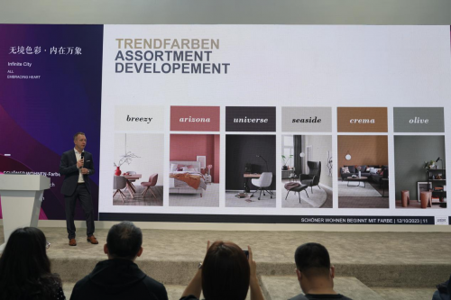 好的市场数据当然离不开好的产品。SCHÖNER WOHNEN-Farbe一直以来以高环保的标准,推出消费者喜爱的色彩。本次论坛,Frederik Strotmann发布2024年年度色仍为芒草暖cosy。此外,Frederik Strotmann表示,预调色一直是SCHÖNER WOHNEN-Farbe的特色产品,2024年还将为中国市场带来6大城市预调色Trendfarbe新色。Dirk Nienhaus则对预调色代表天鹅堡预调色Designfarben做了产品介绍及新色推介。