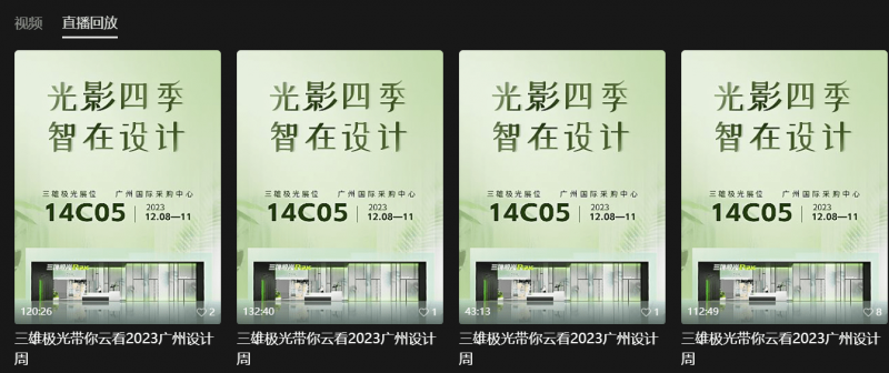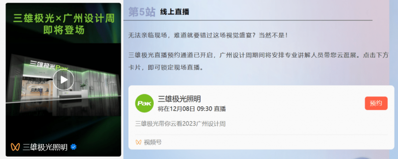三雄极光在广州设计周还未正式启幕时,便已在官方视频号发布参展预告视频,并发起直播预约通道,同时邀请多位业界设计师精英拍摄打call视频,进行大力宣传预热,吸引更多设计师的关注。而在为期四天的广州设计周期间,由专业人员在现场直播详细讲解,为大家揭晓惊喜。这也成功吸引到了现场观众的注意,纷纷到一旁聆听,或转发直播给亲朋好友,视频号评论互动区也一同热闹起来。与此同时,在广州设计周首日便通过视频号发布展位记录视频、盘点设计师高关注产品的主题视频,持续输出优质视频内容。