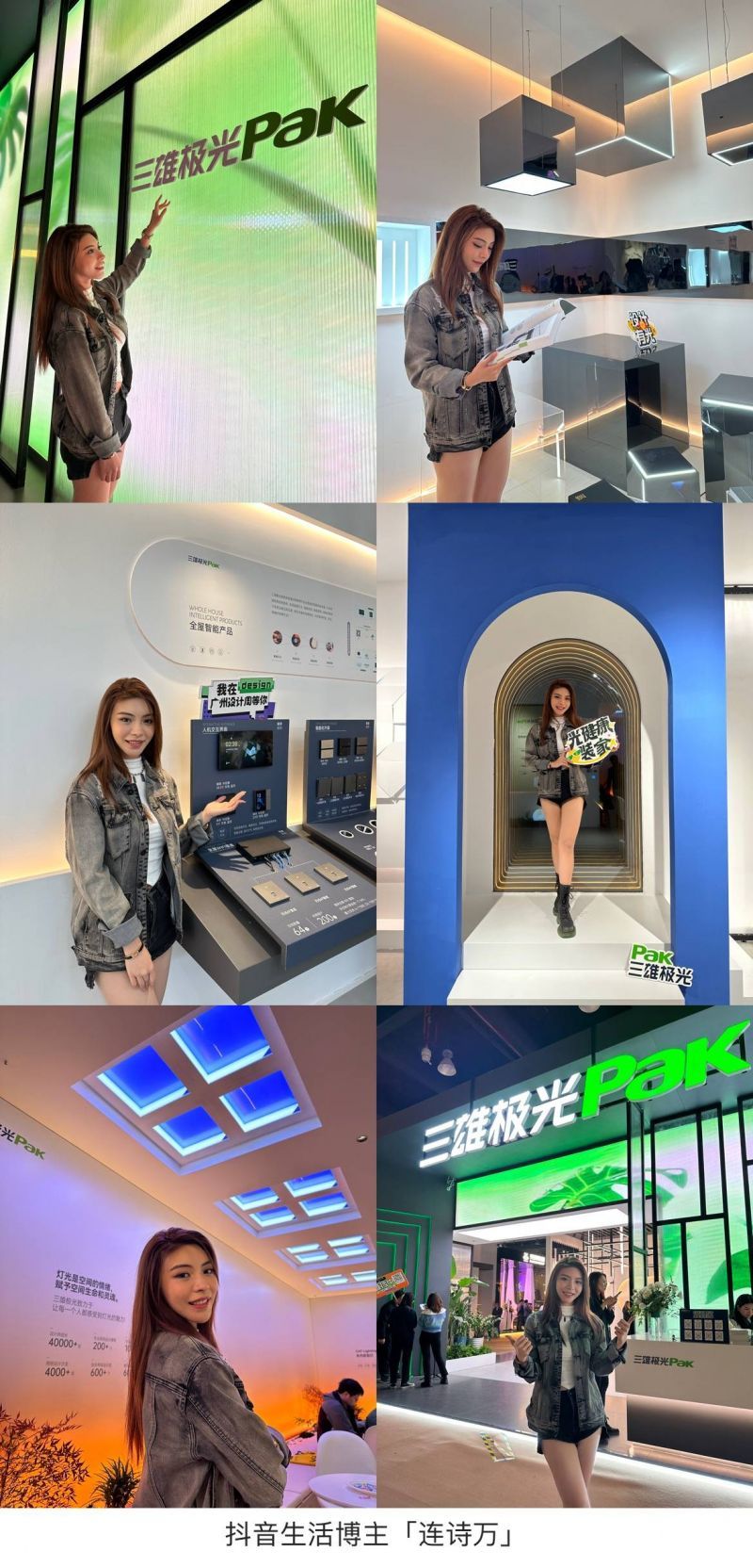 展会期间,受三雄极光邀约的多位网红家居达人、时尚博主,专程来到现场探展打卡并发布短视频助阵,她们在现场借助物料牌拍照以及口播录制视频,并且与照明设计师交流,为感兴趣的网友提前详细讲解了三雄极光众多产品的卖点,这也引起了许多现场观众的围观,达人探展成为了三雄极光展位一道亮丽的风景线。