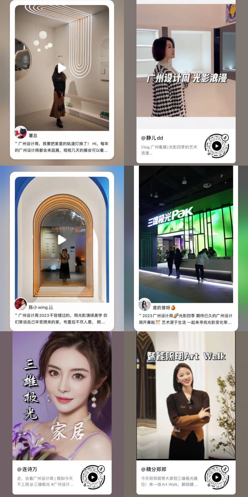 在一众达人的影响力加持下,三雄极光此次广州设计周展位在抖音、小红书等平台的线上声量,也被推至高潮,加之三雄极光官方视频号联动直播、同步达人探展视频持续吸揽注意力,创造出公众曝光度新高,进一步吸引全网密切关注。截至12月11日,小红书达人探展视频播放量10万+,点赞互动量超5000+;抖音达人探展视频播放量总计500万+,点赞互动量10万+。
