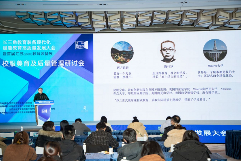 12月15-17日,“长三角教育装备现代化赋能教育高质量发展大会暨首届江苏(苏州)教育装备展”在苏州国际博览中心举办。展会期间,由江苏省教育装备行业协会主办,无锡市教育局、无锡市教育信息化和装备管理服务中心承办,伊顿纪德·優教育协办的“校服美育及质量管理论坛”于12月16日成功举办。来自江苏、上海等地教育主管部门、企业代表、高校专家共聚姑苏,从美育逻辑起点出发,沉浸于一段“审美教育场”的思想对话与行动探讨,努力建立家庭美育、学校美育、社会美育相互联系的美育工作体系。