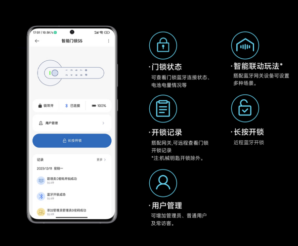 门锁已接入米家,使用米家平台可对门锁进行管理控制,通过手机操作可实现常开模式的设置、远程查看开锁记录、或者联动其他米家生态智能产品,设置个性化场景联动等。