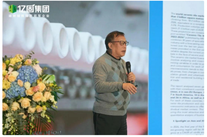 接着,佛山市陶瓷行业协会秘书长尹虹博士分享了《陶瓷行业的趋势及亿固的机会》,尹博以独特的视角对陶瓷行业进行了分析,从尹博分享的数据得知,2022年世界瓷砖产量不仅没有增长,反而下降了9.7%,2023年也在继续下滑,虽然2023年是瓷砖行业非常困难的一年,但危机与挑战并存,动荡意味着打破平衡,打破平衡孕育或创造新的机会来临。