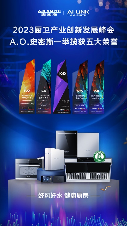 作为“健康厨房”的先行者,A.O.史密斯受邀出席,并荣获主办方现场颁发的“2023年度厨卫产业领军品牌”、“2023年度厨卫行业高端产品”(自旋式洁霸洗碗机DWQ15-R3HWi/R3Wi、嵌入式蒸烤一体机KZQ45-M5Wi)、“2023年度厨卫行业畅销产品”(「瀞」油烟机CXW-200-S9)以及“2023年度厨卫行业创新产品”(橱下冷热即饮净水机DR4000DC1)五项大奖,一举成为本届峰会的关注焦点!