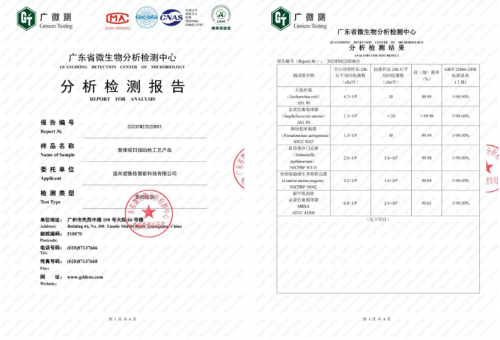 而应用了这项黑科技的千年舟抗菌涂层门执手根据广州微生物分析检查中心的检测结果 (报告编号2023FM22020R01),其对于大肠杆菌、金黄色葡萄球菌、铜绿假单胞菌、鼠伤寒沙门氏菌等菌种,具备高达99%以上抗菌效果。集高效广谱、安全无毒、效果持久等多方面优势于一身,从细节处防菌、抑菌,守护家人健康。