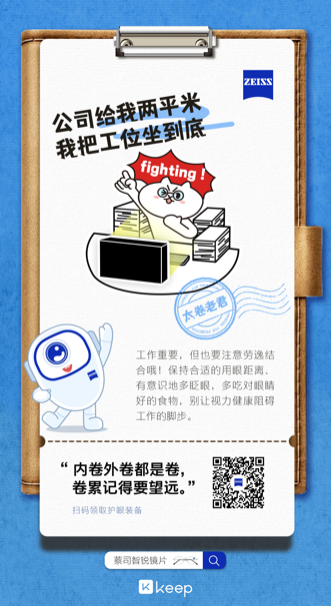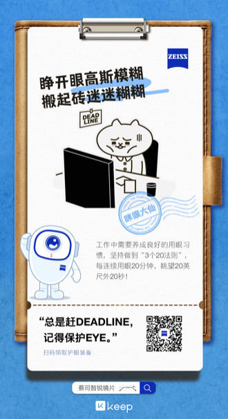 在本次活动中,蔡司光学倡导全民坚持良好的用眼习惯,并通过配戴合适的眼镜保持清晰视觉,定期进行眼部体检,及时发现眼部健康问题。系列创意海报,也通过生动有趣的文案和画面,有效传递护眼理念,并激发用户对蔡司智锐镜片的兴趣度与购买欲。