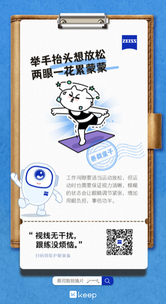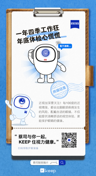蔡司光学作为“职人季”合作伙伴,与Keep共同发起“职场诊脉”的互动体验报告,唤起职场人群保护眼健康的意识。蔡司光学一直致力于挖掘细分人群的用眼需求,为用户提供专业的个性化解决方案,并通过跨界创新营销模式不断拓展用户圈层。而Keep作为“运动科技第一股”,拥有大量热爱运动的职场人士,蔡司光学借此契机成功对眼健康保护与视觉体验的关注,推广给更精准的职场人群,为Keep用户提供个性化解决方案,精准触达潜在消费人群,占领用户心智。