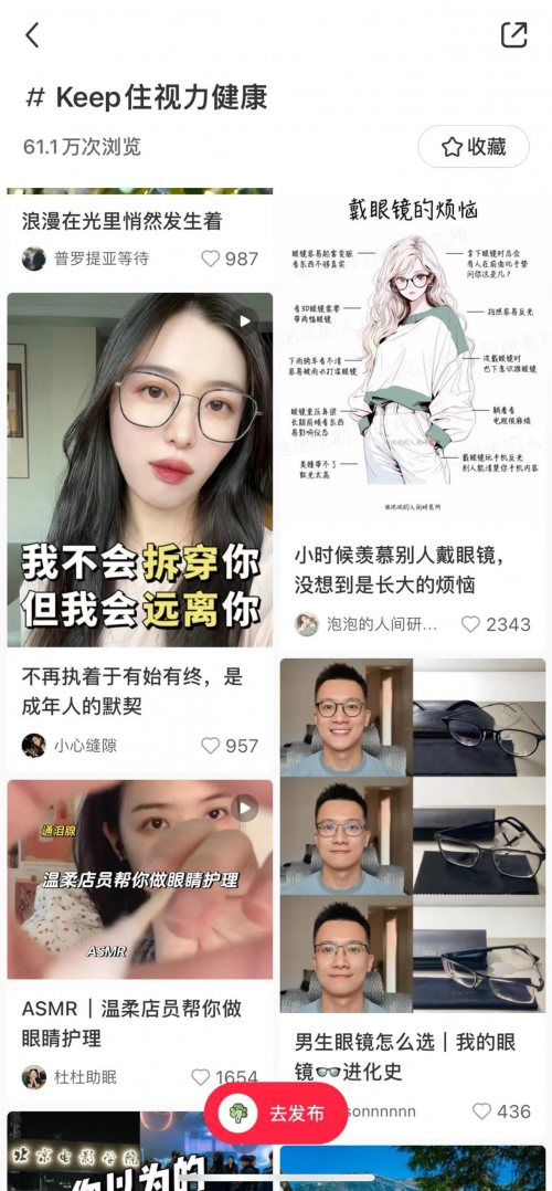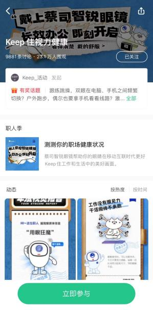 此次“职人季”创新跨界营销活动,共计吸引65万名用户参与“职场诊脉”活动,吸引超过13万名用户进行活动分享,蔡司光学也向超过23万名用户派发“护眼礼包”。蔡司光学在Keep的站内话题#Keep住视力健康,也从23年8月以来累积吸引23万人关注,话题内有超过1万名用户分享运动用眼心得。