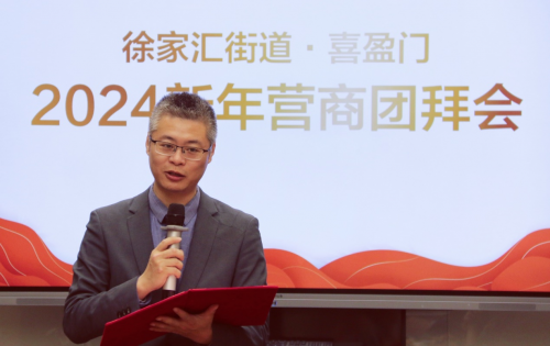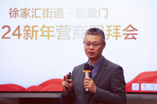上海喜盈门总经理尤军主持会议并致辞,对徐家汇街道领导、徐家汇经济发展有限公司领导以及各位商户代表的到来表示热烈欢迎。
