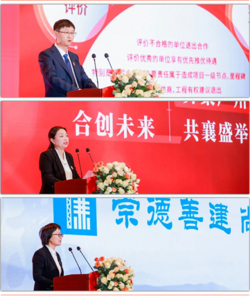 九层之台,起于累土,合抱之木,生于毫末。大会对2023年优秀供应商进行隆重表彰,颁发了“同心筑梦奖”“精诚合作奖”“玖筑共建奖”“携手共进奖”“风雨同舟奖”;优秀分供方代表华为终端有限公司、汇张思建筑设计事务所(上海)股份有限公司分别进行VCR展示,邵洋、张润舟相继上台交流,分享与“玖”同行的发展故事,展望未来美好合作蓝图。