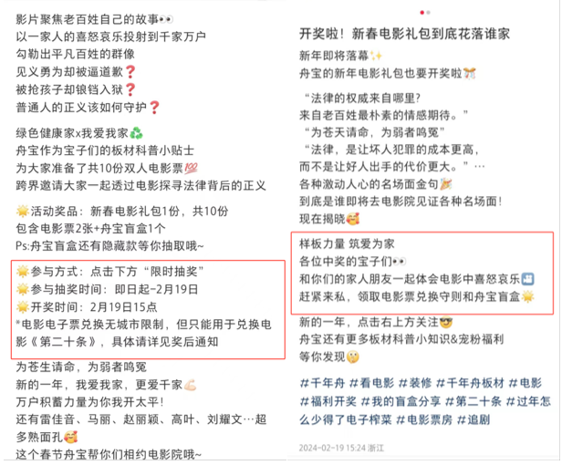 作为电影《第二十条》联合推广伙伴,有了前一年的经验,千年舟在电影营销上驾轻就熟,活动期间便开启线上直播和多平台宣传,形成品牌传播矩阵,线上线下齐发力,实现品牌与用户双向奔赴。