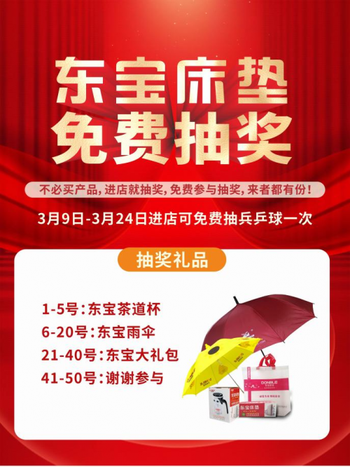 为感恩回馈广大新老顾客一直以来对东宝床垫的支持与厚爱,3月9日-3月24日,东宝床垫东莞专卖店举行免费抽奖活动,不必买产品,进店就可以免费抽奖!