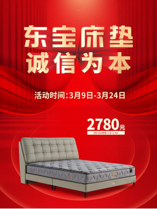 春风送暖,万象更新。为配合大家的家居焕新大计,3月9日-3月24日,东宝床垫举行开门红活动,推出两款高性价比的产品,回馈广大消费者的支持与认可。