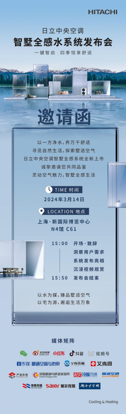以一方净水,养万千舒适。日立中央空调智墅全感系统将于本届展会首次亮相!新品从人体舒适驱动科技的人本精神回归,充分挖掘春夏秋冬四季天气痛点和不同生活场景。以日立中央空调全球用户大数据模型为基础,集制冷、地暖、新风、除湿、加湿系统于一体;一键智启,AI算法自动运行,自感知自处理,定制四季舒适,打造高端墅适好空气。