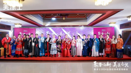 在营销峰会颁奖晚宴上,美涂士对在2023年度为美涂士高质量发展作出重大贡献的经销商家人进行了荣耀表彰,同时美涂士核心管理层以国潮形象惊喜亮相,为在座所有经销商伙伴献上最美的祝福,愿未来美涂士继续与携手广大经销商,共赢发展新机遇,共创美好新未来。