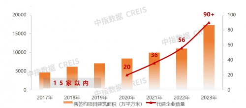 图:2017-2023年房地产代建新签约项目面积与企业数量趋势(来源中指研究院)