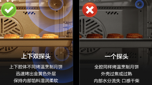 有时候在烘烤过程中,要对温度有着非常精准的控制,比如烤披萨,上层温度要达到180度,下层为200度,温差达到20度才能保证披萨咬起来上层松软下层酥脆。怎么能达到精准控温,这就要依靠腔内的温控探头,老板蒸烤炸一体机CQ9068上下各1个探头,一共2个,可以精准控温,这几乎就是高端蒸烤炸一体机的标配了。很显然,市场上一些较低端的产品,不会明确标注几个温控探头,这种基本就是1个,而这也意味着你不能用它来做复杂的美食。