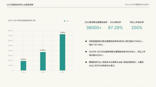 目前,据《白皮书》显示,我国已接受过职业整理师培训的总人数超过73000人,相比之前增长了97.29%。这一数字的增长不仅体现了整理收纳行业的快速发展,也反映出消费者对专业整理服务的需求日益旺盛。同时,2022年至2023年全国新增职业整理师36000余人,同比去年增长超过200%,这一惊人的增长速度进一步证明了整理收纳行业的火热势头。