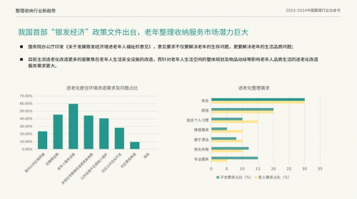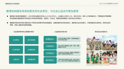 随着老龄化社会的到来,老年人群对于整理收纳的需求将不断增长。这一趋势不仅为整理收纳行业提供了新的增长点,也为从业者提供了更多的创新空间。从业者可以针对老年人的特殊需求,设计易于操作的收纳工具、提供上门整理服务等,为老年人打造更为舒适、便利的生活环境。同时,也可以通过与养老机构、社区服务等领域的合作,共同开发老年整理服务市场。