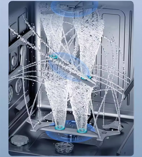 其次是凯度净魔方系列洗碗机还升级了四面全劲洗结构,突破传统中心喷淋清洁结构,在内腔上下左右皆设有喷淋臂,全方位包裹碗篮,清洁覆盖面积大大提升,真正实现上下左右全喷淋,四面八方全净洗!