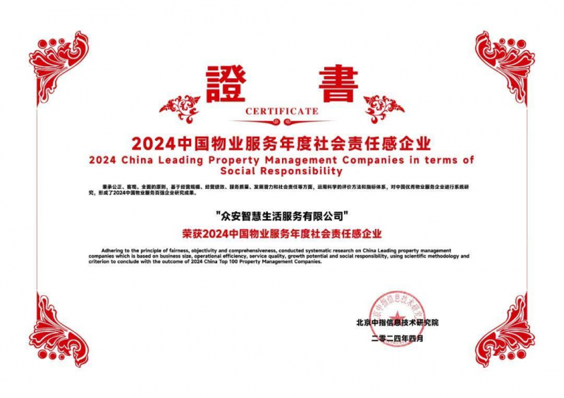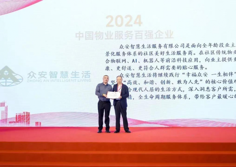 众安智慧生活服务有限公司(以下简称:众安智慧生活)荣膺“2024中国物业服务百强企业”、“2024中国物业服务年度社会责任感企业”两项荣誉。
