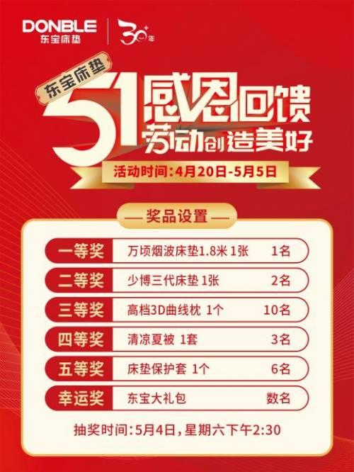 为回馈广大新老客户一直以来的支持与认可,东宝床垫东莞专卖店将于5月4日星期六下午举办免费抽奖活动,免费送出1.8米弹簧床垫、少博三代学生床垫、高档3D枕头、清凉夏被等丰厚奖品!