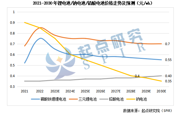 据起点研究院(SPIR)预测:到2030年,三元锂电池/磷酸铁锂电池/钠电池/铅酸电池平均售价将分别为0.70/0.55/0.35/0.40元/wh,钠电池有望成为四种电池中成本售价最低的电池,同时,钠电池市场规模有望达到1132Gwh,市场规模突破3900亿元,电动汽车和储能将成为钠电池最大的应用领域。