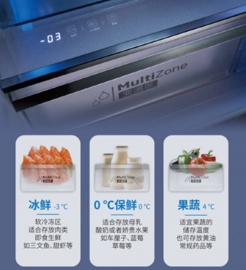 冰箱内置新鲜变温空间,支持-3℃、0℃、4℃三档温度调节,精准匹配各类食材的储温需求。从鲜美肉类到嫩滑海鲜、脆嫩果蔬至各色美味,每类食材皆能找到其理想的保鲜温度,开启无限储鲜可能,悠享定制级保鲜艺术。