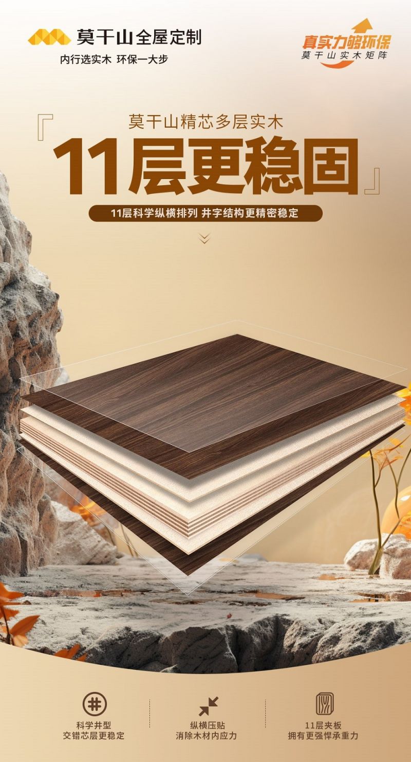莫干山精芯实木多层板,使用11层夹板,相比常见的7层或9层的多层板,性能更稳固,承重更强悍。内部结构升级,按照科学组胚平面分布,整板整芯纵横压贴,消除木材自身内应力,科学井型、交错芯材优化板材性能,更加结实耐用,使用寿命更长。
