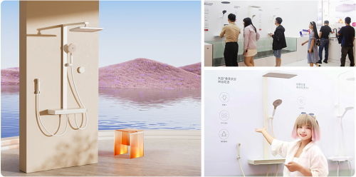 “香草天空淋浴花洒”,超大置物平台、多水花模式花洒、智能数显等实用功能,搭配冰蓝氛围灯与奶油色外观,引得许多来宾连连驻足,纷纷试用,更吸引无数卫浴、居家博主前来体验打卡。