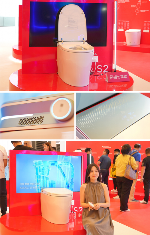 在大白雷霆除臭S2 智能马桶的另一侧,是大白即将在未来推出的又一重磅新品——大白秘密花园前置私洗智能马桶。它在后端洗护喷杆之外,创新地加入前置清洗喷嘴,既保证了“菊部”的清洁,又兼顾私处“秘密花园”的健康清爽。超前的设计理念,引发来宾纷纷点赞。