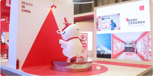 在大白展区的另一侧入口,一只高达2m,红发、白身、圆滚身材的巨型独角兽格外显眼。它就是大白自主设计的IP形象,头顶的智能光圈,回应受众对智能与健康卫浴的期许,舒适自得的表情,彰显Design in China的自信。