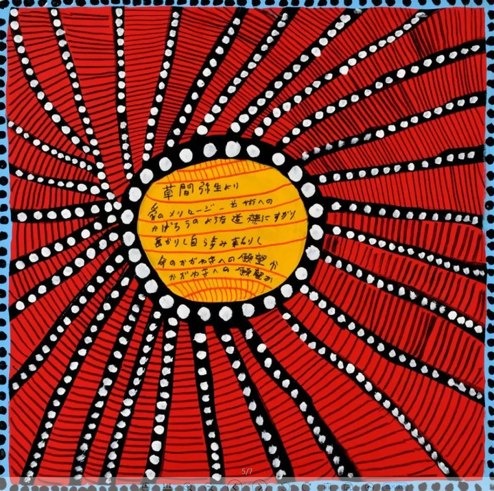 此次展览是草间弥生在上海大田秀则画廊洛克·外滩源新址的首展,将呈现其自2021年以来积极创作的《每天我都为爱祈祷》系列中的56幅绘画以及新手稿。她以“文字”的形式更新了自己的表达语言。在网、点、侧脸等代表性图案重复出现的同时,草间经常将马克笔和丙烯颜料混合使用,在画布上画出一个或多个圆,并用日语或英语在圆中写上自己的诗和信息。笔触轻重缓急生动地传达了她的呼吸节奏。这些文字充满了诗人草间对生命的无限渴望和与世界分享艺术的意愿,以及对自身死亡的感知。