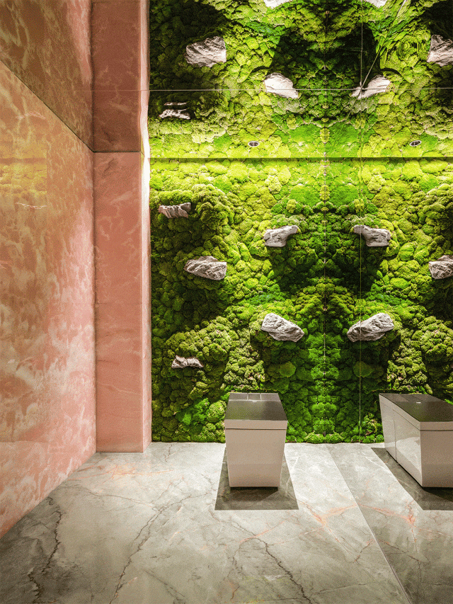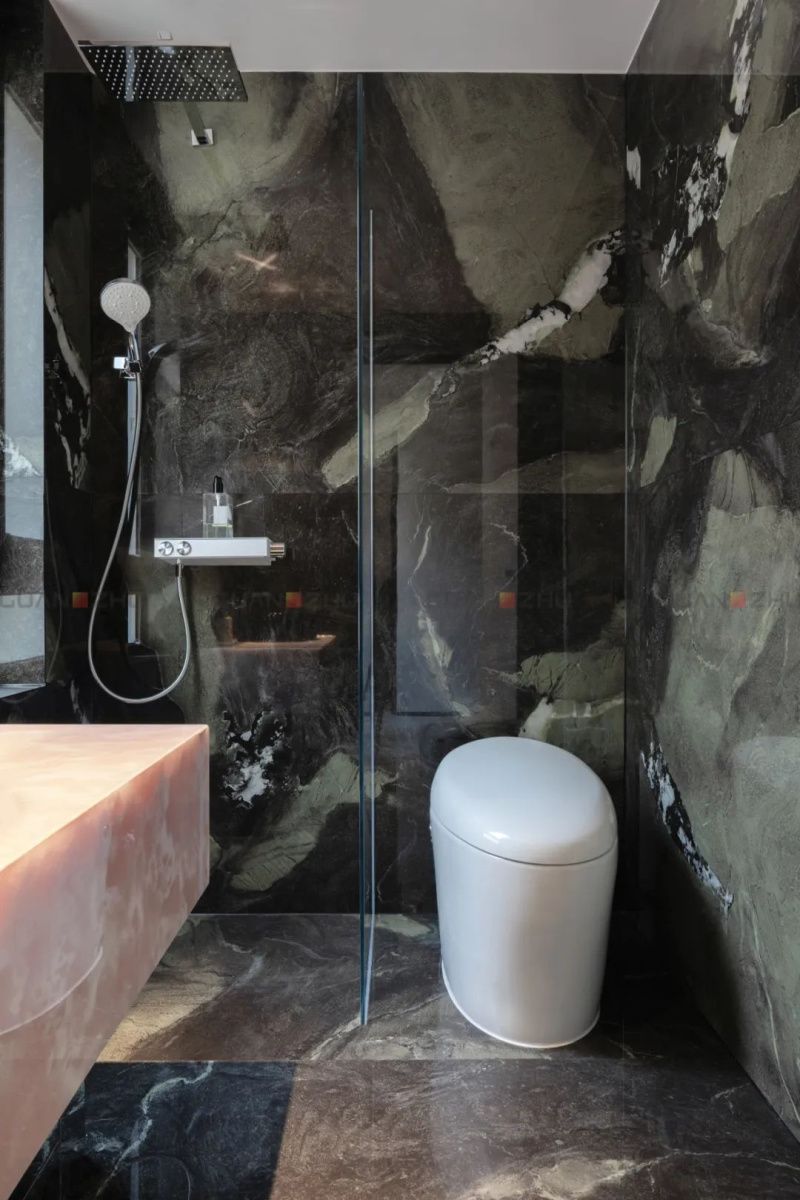 负一层洗手间地面延用冠珠华珍岩板碧波绿,整体空间连贯统一,似万顷碧波上的一座岛屿。洗手间搭配主卧卫生间同款粉色大理石,结合墙面的绿植、石头装饰,营造舒适、宁静的氛围之美。