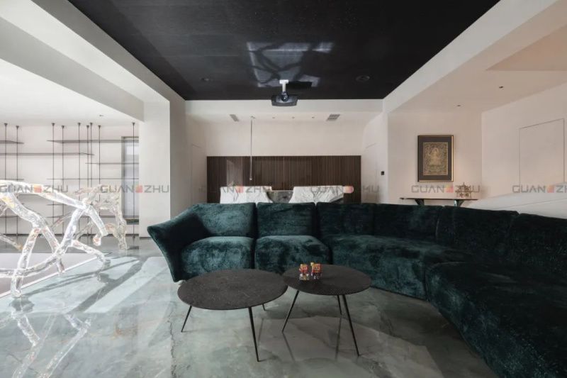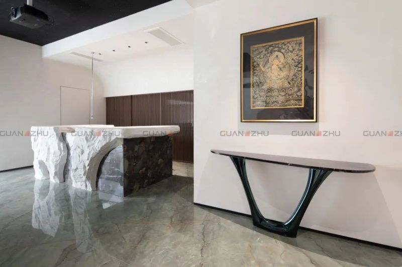 冠珠华珍岩板碧波绿大面积使用在负一层公共会客区域的地面上,冠珠华珍岩板碧波绿青翠欲滴,仿若一汪清波荡漾开来,给人一种如沐春风的感觉,将东方美学的情调和意境发挥得淋漓尽致。