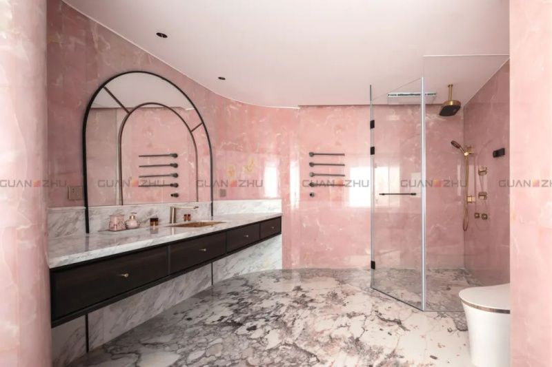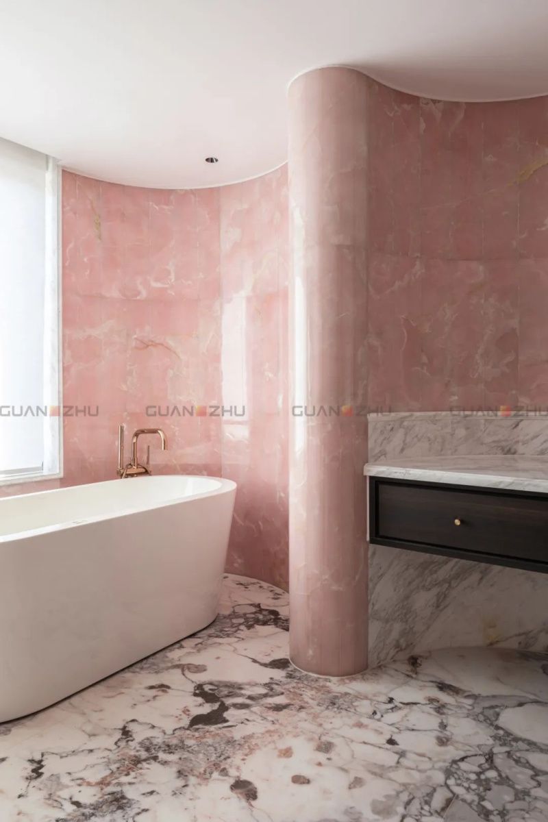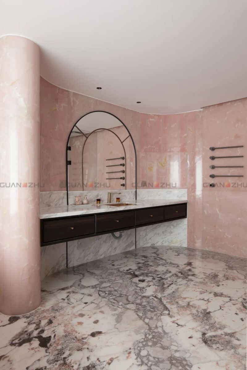 紫色在中国传统文化中代表着高贵典雅,给人一种神秘的感觉,案例中冠珠华珍岩板琉璃紫运用在主卧盥洗空间的地面,岩板的纹理丰富如同锦簇花团般,与墙面的粉色大理石搭配,整个空间营造出温润柔和的力量感,传递出中国传统文化中的婉约柔美。