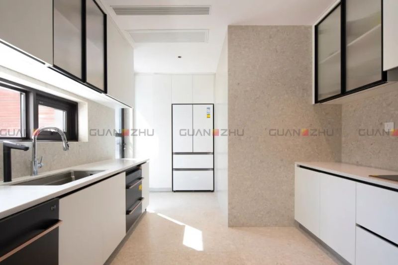 设计师还在厨房使用了冠珠瓷砖月光白、大花白的搭配,阳光映照,空间和谐柔美,温柔的气息映照浓浓的人间烟火,宛然一派岁月静好。