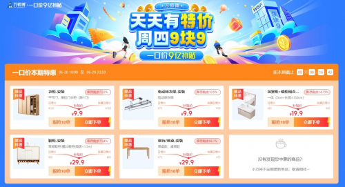 以6月20日上线的最新活动为例,一口价安装服务覆盖衣柜、电动晾衣架、浴室柜+镜柜组合、鞋柜、餐柜等热门单品,同时满足家具、卫浴、智能家居三大品类商家需求。