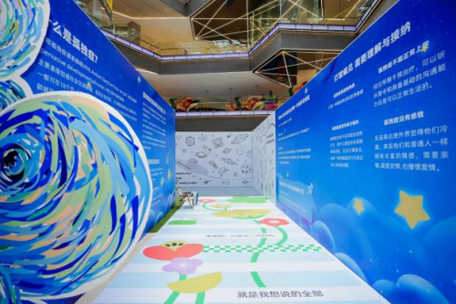 9月7日—8日,萧山众安广场一楼中庭里人头攒动,聚集在一座蓝色主题的乐园周边,乐园入口处播放着清脆的童声,讲述着孤独症儿童的内心独白;漫游其中,地面精心设计了地贴指引,以孤独症儿童的口吻,引导着参与者向前探索他们的内心世界;在迂回的乐园通道里每隔几步就是一处神秘打卡点,“秘密星球、璀璨星河、星星世界......”多个主题互动让爱心人士在参与中逐渐加深对孤独症儿童的理解。