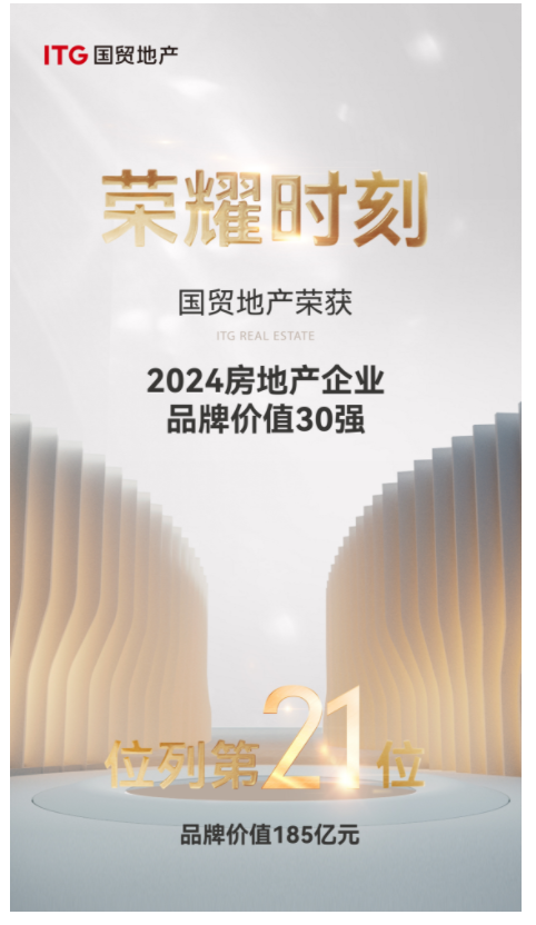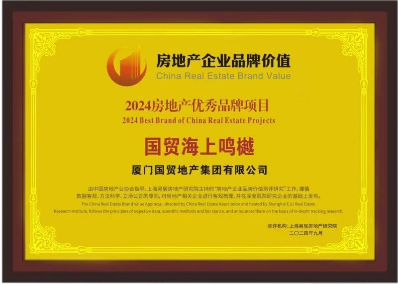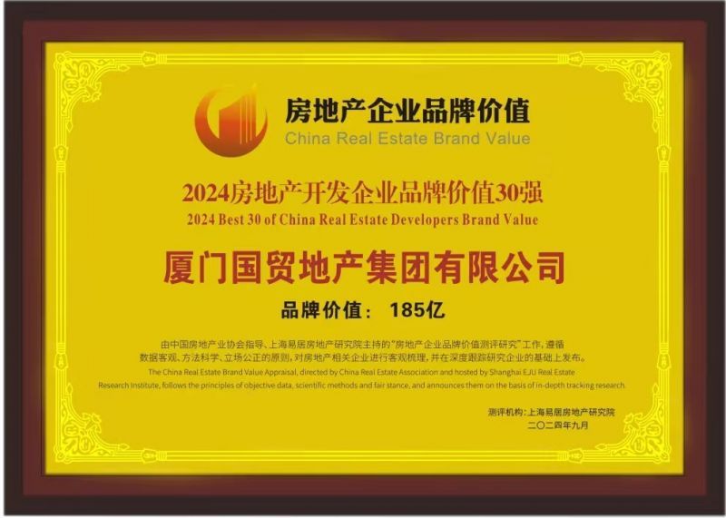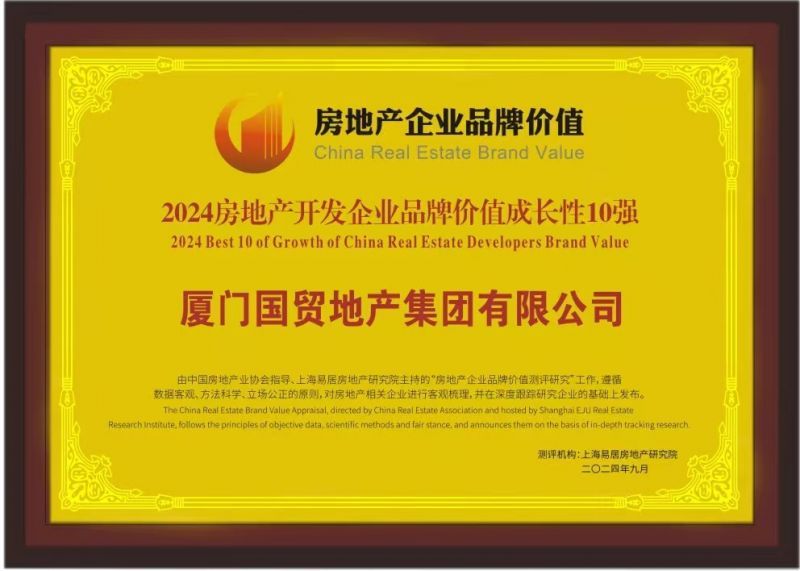 国贸地产凭借卓越的品牌价值和美誉度,荣获“2024房地产开发企业品牌价值30强(第21名)”,品牌价值185亿元,比2023年提升35亿元,排名提升6位;并上榜“2024房地产开发企业品牌价值成长性10强(第4名)”。收获品牌荣誉的同时,国贸地产依托37年的开发运营积淀和客户的高度认可,旗下住宅项目——厦门国贸海上鸣樾荣获“2024房地产优秀品牌项目”奖项。