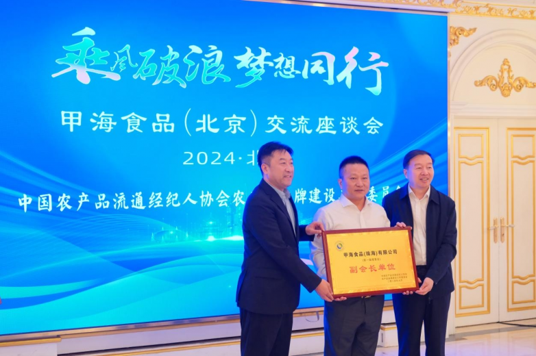 会议最后,由中国农产品流通经纪人协会会长刘跃忠和中青通乐商业运营管理有限公司董事长、中经联品牌委主任黄继民共同为甲海食品(珠海)有限公司颁发中国农产品流通经纪人协会农产品品牌建设工作委员会副会长牌匾。