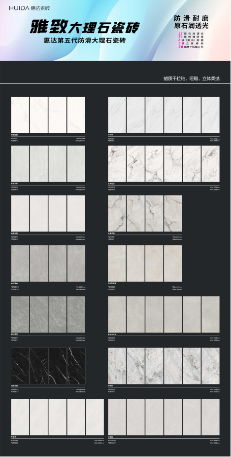惠达瓷砖在经典上再寻创新,借助自然珍稀石材的力量,从注重每一处细节的精细工艺中诞生第5代防滑瓷砖——雅致大理石。用防滑瓷砖消解地板基于几何学的定义,让漫步(步履)尽显安全、自由,跃动更随心,将科技与美学溶解于每一片砖,不断迭代创新,呈现功能与美学共生的防滑大理石瓷砖。