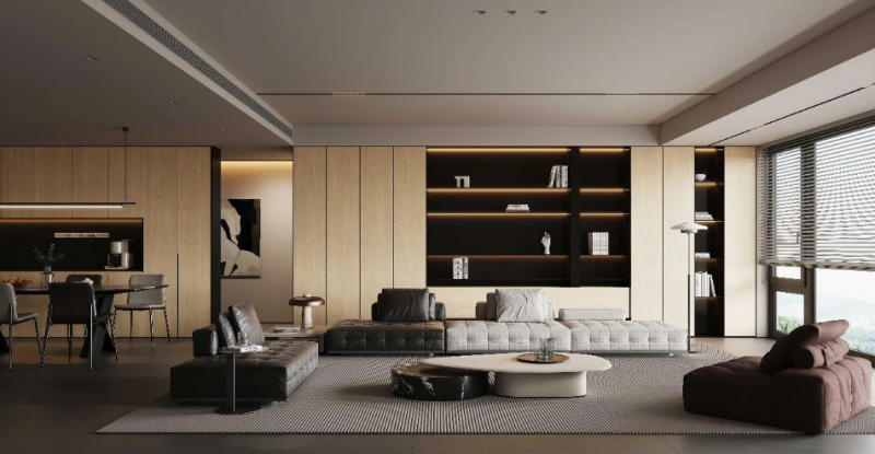 浅山流韵色调中和且纯度低,与深空灰搭配尽显含蓄低调,但又不失单调感。这种搭配无论是现代简约、北欧还是新中式风格,都可以通过巧妙的软装和布局展现出其独特的魅力。