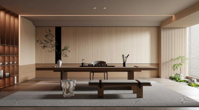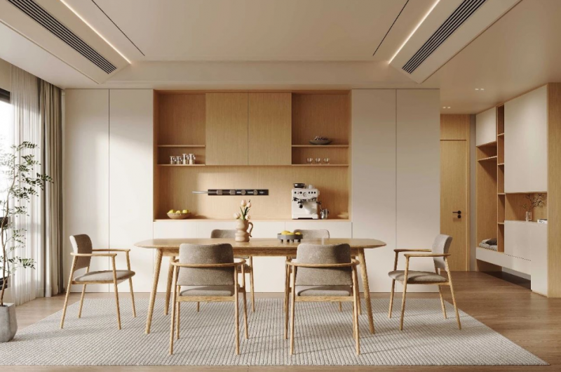 春日胡桃是一种原生胡桃木纹,天然的艺术美,运用在茶室空间中营造出一种清新、雅致的氛围,非常的适合进行阅读、思考或品茶等活动。这种色调能够减轻视觉上的压力,让人在此空间中感到轻松自在。