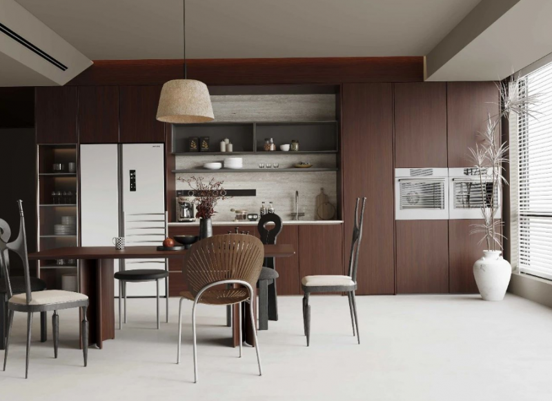 庆云胡桃色泽典雅高贵,搭配洞脉星石,可以营造出一种既古典优雅又现代时尚的氛围,为空间增添一份艺术气息,这种艺术效果不仅可以提升空间的品味和档次,还可以为居住者带来一种美的享受和艺术的熏陶。