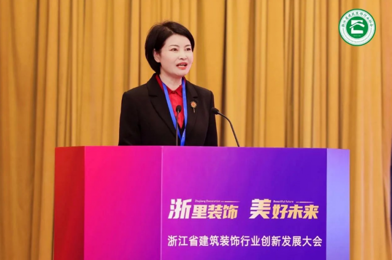 浙江省建筑装饰行业协会会长贾华琴出席会议并致辞。她在会议中强调了科技创新对行业发展的关键作用,倡导绿色、可持续发展,鼓励与会者积极交流,为浙江省建筑装饰事业注入源动力与创新力,为建设更加绿色、和谐的行业环境和卓越发展贡献智慧与力量。