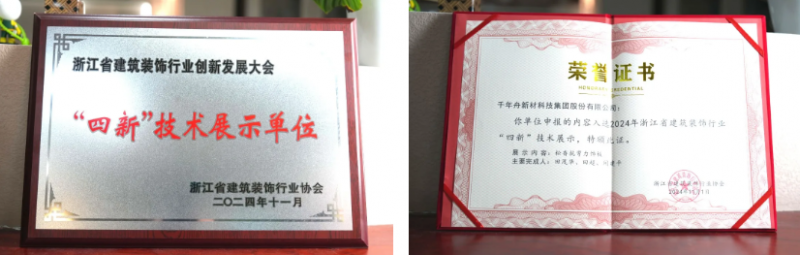 千年舟凭借在技术创新、智能制造、产品研发的创新发展成果和对行业绿色低碳发展全方位赋能的杰出贡献,获颁浙江省建筑装饰行业协会“四新技术展示单位”。