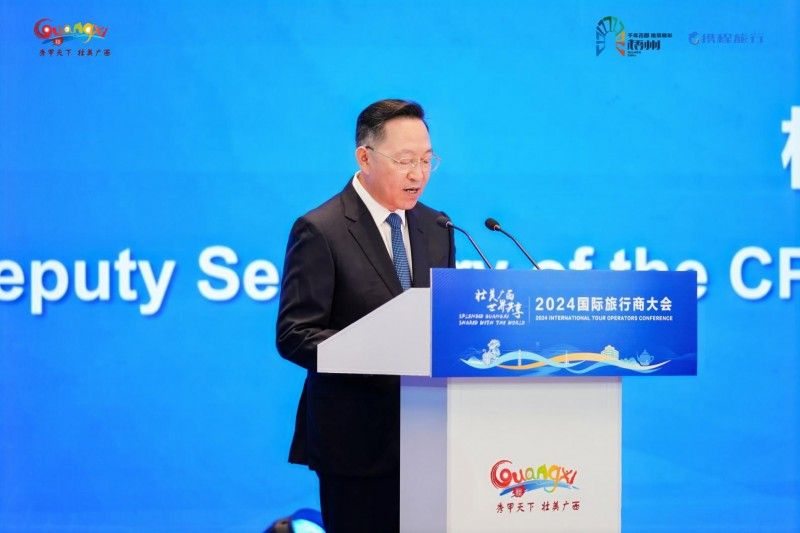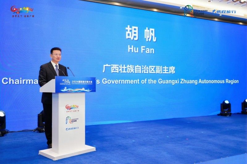 广西壮族自治区副主席胡帆发表致辞。他代表广西壮族自治区人民政府,向出席大会的嘉宾和业界代表们表示热烈欢迎,并指出,近年来,广西注重发挥区位优势,把文化旅游业作为重要的战略性支柱产业,加快打造文化旅游强区,持续推进广西世界级旅游目的地建设。今年前三季度,广西接待国内外游客7.69亿人次、其中入境过夜游客81.7万人次,旅游总收入达8058.75亿元,广西文旅国际影响力不断扩大。此次大会围绕“壮美广西 世界共享”主题,对话世界旅游、共享广西之美,全面展示广西的自然风光与民族文化,共享旅游资源与工作经验,必将进一步促进世界各地旅行商与广西旅游更广领域合作。